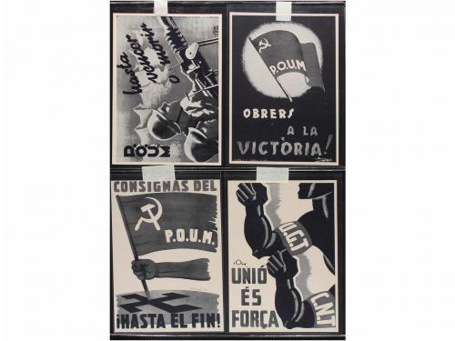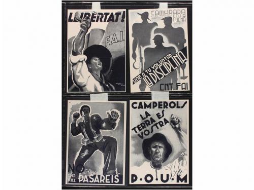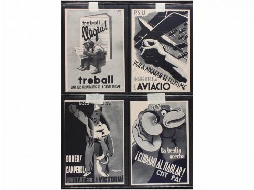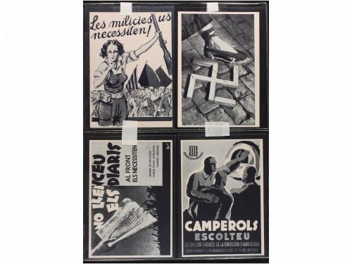 1937 ca. POSTALES. (GUERRA CIVIL). COLECCIÓN COMPLETA DE 20 POSTALES DEL COMISARIAT DE PROPAGANDA DE LA GENERALITAT DE CATALUNYA. Todas con propaganda anti fascista, llamamientos a la lucha y la resistencia. 20 Postales en b/n presentadas en hojas de álbum, buena conservación.