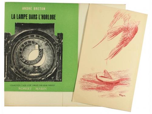 1948. LIBRO. (SURREALISMO). BRETON, ANDRÉ:. LA LAMPE DANS L'HORLOGE. Paris: Ed. Robert Marin, 1948. 8º mayor cuadrado. 71 p. + 1 h. Ilustr. con una litografía original de Toyen. Ejemplar intonso e impostado. Rústica original. Ejemplar de la tirada numerada de 350 ejemplares sobre papel de hilo.