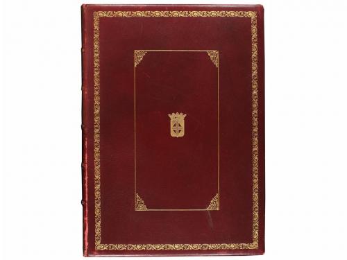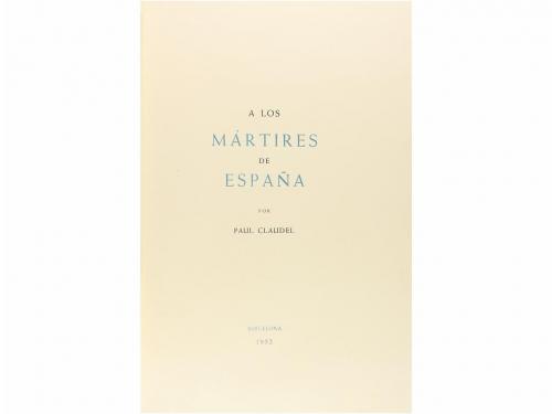 1952. LIBRO. (BIBLIOFILIA). CLAUDEL, PAUL:. A LOS MÁRTIRES DE ESPAÑA. Barcelona: Publ. Diputación Provincial de Barcelona, 1952. Folio. 29 p.+ 1 h. Edición numerada de 250 ejemplares sobre papel de hilo, con la firma del autor. Texto bilingüe en francés y castellano. Enc. en piel, ruedas doradas, nervios, corte superior pintado, guardas de seda. Lomera algo rozada.