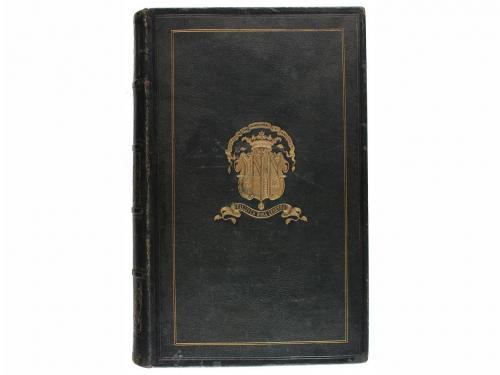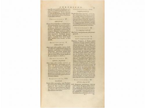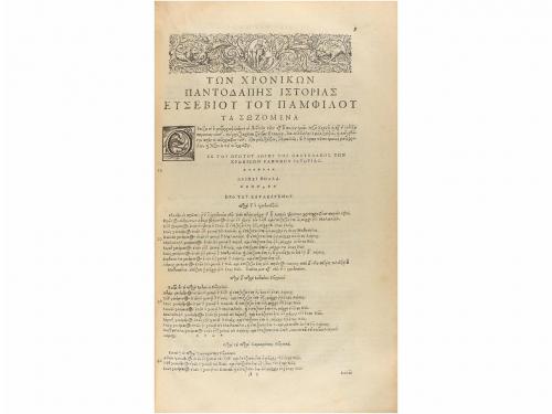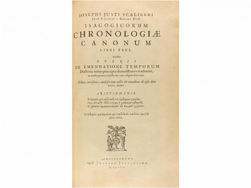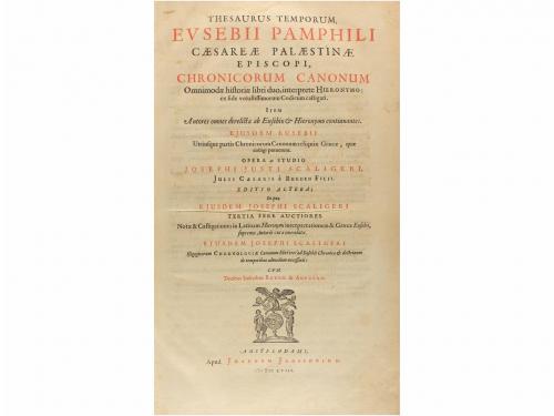 1658. LIBRO. (HISTORIA CRISTIANA). THESAURUS TEMPORUM... EPISCOPI CHRONICORUM CANONUM Omnimodae historiae libri duo, interprete Hieronymo... Opera ac studio JOSEPHI JUSTI SCALIGERI... Amstelodami, Lugduni Batavorum: Typis Nicolai Herculis, Joannem Janssonium, 1558. Folio mayor. 23 h. + 197 p. + 10 h. + 85 p. + 435 p. + 260 p. + 24 h. + 350 p. + 2 h. Portada a dos tintas con marca tipográfica. Cabeceras, capitales y culs-de-lampe xilografiadas, algún estado en el texto. Texto a una, dos y tres columnas en griego y latín, apostillas marginales. Cerco de humedad en el margen superior de las primeras p. y en el margen superior e inferior de las últimas. Mínima falta de papel marginal en una p., no afecta texto. Bella enc. en plena piel verde con superlibris de J. Gómez de la Cortina, MARQUÉS DE MORANTE, lomera con dorados y nervios, cantos y cejas, cortes dorados; ligeramente rozada. Exlibris de anterior poseedor. La obra que presentamos contiene 5 partes, es una de las obras referentes sobre el cristianismo arcaico. "Eusebio amigo de Pámfilo" fue obispo de Cesarea, es considerado como padre de la historia de la iglesia católica.