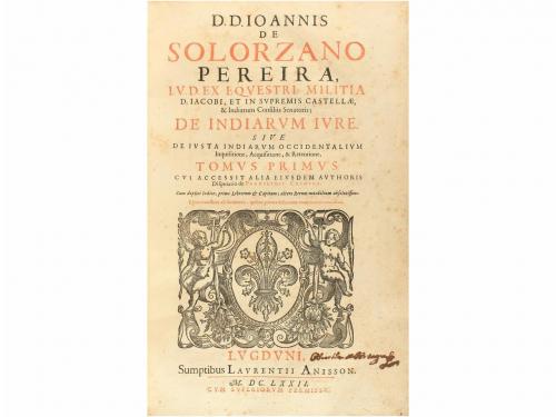 1672. LIBRO. (DERECHO). DE INDIARUM IURE. SIVE DE IUSTA INDIARUM OCCIDENTALIUM INQUISITIONE, ACQUISITIONE, & RETENTIONE. Lugduni [Lyon]: Laurentii Anisson, 1672. 2 vol. en folio menor. I: 12 h.+ 438 p.+ 43 h. II: 6 h.+ 858 p.+ 94 h. Portadas a dos tintas y con viñeta de marca del impresor grabada en madera. 2 vol. enc. en pergamino flexible de época, lomeras rotuladas. Algún punto de óxido y marca manuscrita de anterior poseedor. Muy rara y antigua edición (en pleno siglo XVII), del Indiarum Iure, la recopilación más importante del "Derecho Indiano". Solórzano fue el más destacado publicista del derecho indiano, jurista formado en la universidad de Salamanca que obtuvo el título de oidor de la Real Audiencia de Lima, dado por el rey Felipe III en provisión real. Felipe IV le concedió el hábito de caballero de la Orden de Santiago y además el título de Consejero del Supremo Consejo de Castilla, cargo que ejerció en calidad de honorario debido a su progresiva sordera, enfermedad que a la larga lo jubiló. El derecho indiano tuvo un principio caótico que fue necesario sistematizar, tarea a la que se dedicó Solórzano para lograr un corpus ordenado. Palau 318977.