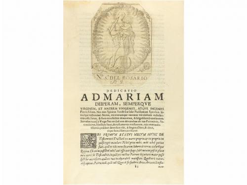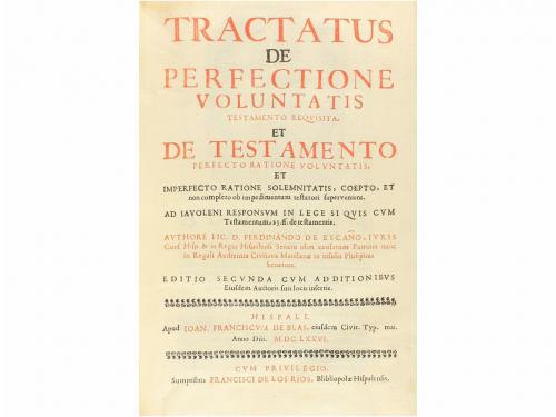 1676. LIBRO. (DERECHO). ESCAÑO, FERDINANDO DE:. TRACTATUS DE PERFECTIONE VOLUNTATIS TESTAMENTO REQUISITA ET DE TESTAMENTO PERFECTO RATIONE VOLUNTATIS... Hispali [Sevilla]: Apud Joan. Franciscum de Blas, cum privilegio, sumptibus Francisci de los Rios, Blibliopolae Hispalensis, 1676. 4º menor. Texto a dos columnas. 10 h.+ 312 p.+ 18 h. Portada dos tintas. Grabado calcográfico de la Virgen del Rosario. Enc. en pergamino flexible de época, con lomera rotulada. Segunda edición ampliada por el autor. F. Escaño (Sevilla 1630 ca.- Manila 1676 ca.) fue abogado oidor en Filipinas, donde además de ejercer dedicó tiempo a estudiar y fruto de ello dejó una obra destinada a explicar los requisitos necesarios para la ordenación del testamento y que gozó de mucha difusión en Europa y América.