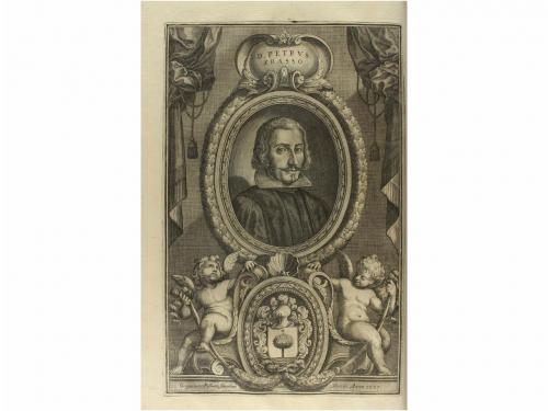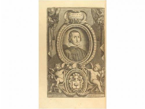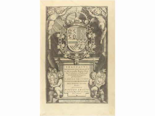 1677-1679. LIBRO. (AMÉRICA). FRASSO, PETRO:. DE REGIO PATRONATU AC ALIIS NONNULLIS REGALIIS, REGIBUS CATHOLICIS, IN INDIARUM OCCIDENTALIUM IMPERIO, PERTINENTIBUS. QUAESTIONES ALIQUAE DESUMPTAE, ET DISPUTATAE IN QUINQUAGINTA CAPITA PARTITAE. Madrid: Joseph Fernández de Buendia, 1677 - 1679. 2 vol. en folio. I: 20 h. (portadilla, frontispicio grabado por Gregorio Fosman en Madrid 1677, portada tipográfica a dos tintas, dedicatorias, prólogo, aprobaciones y licencias, retrato grabado por el mismo artista)+ 12 h. (índices)+ 395 p.+ 53 h. (Index rerum et Verborum). II: 2 h. (portadilla y portada a dos tintas)+ Frontispicio grabado al cobre por Gregorio Fosman en Madrid 1679+ 14 h. (Licencias, dedicatorias, composiciones poéticas laudatorias)+ retrato del autor grabado al cobre, distinto al de la primera parte+ 23 h. de índices+ 458 p.+ 65 h. Enc. en pergamino rígido de época con lomeras rotuladas en caligrafía gótica. Buen estado de conservación. PRIMERA EDICIÓN de este tratado de derecho americano, muy raro con los frontispicios y los dos retratos del autor. Palau 94684. Medina BHA 1626.