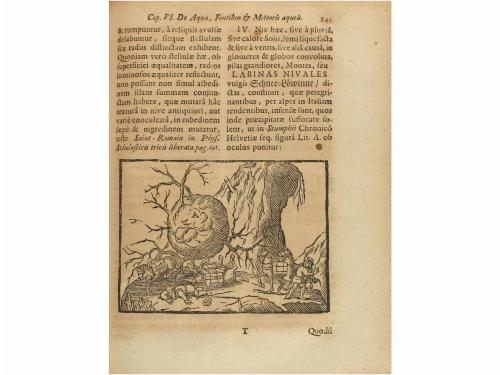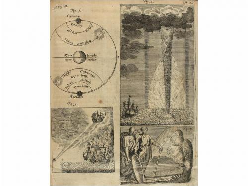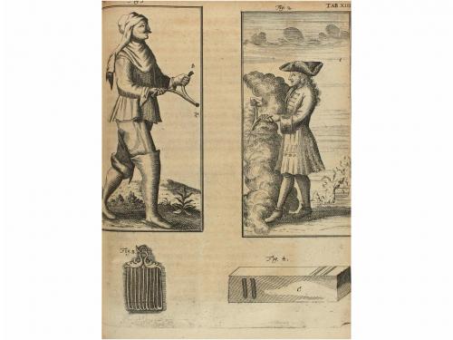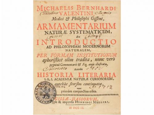 1709. LIBRO. (MEDICINA). ARMAMENTARIUM NATURAE SYSTEMATICUM, INTRODUCTIO AD PHILOSOPHIAM MODERNORUM NATURALEM, PER FORMAM INSTITUTIONUM APHORISTICE OLIM TRADITA, NUNC VERÒ PERPETUÔ... Gissae-Hassorum: Typ. & impensis Henningi Mülleri, 1709. 8º mayor. 30 h. + 176 p. Texto a dos columnas y portada a dos tintas. Ilustr. con un grabado en el texto y 15 lám. grabadas que reproducen instrumentos científicos y técnicos, fuera del texto. Sello húmedo de antiguo poseedor en portada. [sigue:] HISTORIA LITERARIA S. R. I. ACADEMIAE NATURAE CURIOSORUM, COMPLECTENS RECENSIONEM ET CONTENTA LIBRORUM... ID., 1708. 152p., texto a dos columnas. [Sigue:] PRODROMUS HISTORIAE NATURALIS HASSIAE... Id. s.a. (1707 ca.). 38 p. + 1 h. a dos columnas. Papel algo oscurecido en algún momento y algo corto de márgenes ocasionalmente. Tres obras enc. juntas en un vol. en pergamino de época decorado con hierros secos en los planos, restos de rotulación en rojo en la lomera, cortes pintados, restos de antiguos cierres metálicos. PRIMERA EDICIÓN de la obra delmédicao y filósofo alemán Valentini (1657-1729) que dedicó a Federico, rey de Prusia. Nacido en Giessen, comenzó sus estudios de medicina en 1675. Viajó por Francia, Holanda e Inglaterra y fue adquiriendo una importante colección de instrumentos médicos, entre ellos una bomba de aire del taller Musschenbroek de Leiden, gran centro de innovación técnica y científica. Puso en marcha un museo de curiosidades, gracias a él la universidad de Giessen ofreció medicina experimental en su curriculum, la tercera en todo el estado. En la primera obra dedica una parte general al análisis del origen y evolución de la filosofía natural, y sendos capítulos al estudio de los principios de la naturaleza (materia y forma), cualidades de los cuerpos terrestres y celestes (tanto las manifiestas como las ocultas, el aire, el fuego, el agua, los minerales, los vegetales y los animales. Con frecuencia se halla junto a la Historia Literaria, pero no tanto con la tercera obra, la Historiae Naturalis. Valentini analiza los trabajos de varios autores que han dedicado su producción al estudio y divulgación de teorías científicas y curiosidadesde toda suerte y entre los que cita un tratado dedicado a la salamandra y otro a la salvia. En BNFR 31520211, 31520214 y 31520228, respectivamente.