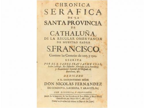 1738. LIBRO. (HISTORIA DE CATALUNYA). COLL, FRAY JAYME:. CHRONICA SERAFICA DE LA SANTA PROVINCIA DE CATHALUÑA, DE LA REGULAR OBSERVANCIA DE. NUESTRO PADRE S. FRANCISCO, CONTIENE LAS CENTURIAS DE 1200 Y 1300. Barcelona: Imp. de los Herederos de Juan. Pablo, y Maria Martí, administrada por Mauro Martí, véndase en su misma casa, 1738. 4º mayor. 21 h. + 381 p. + 6 h. [Más:] ID.: PARTE SEGUNDA. CONTIENE DESDE LOS AÑOS 1400 HASTA LOS DE 1759. Id.: Imp. de los padres carmelitas descalzos, se venden en casa Gabriel Paged librero, 1764. 13 h. + 572 p. Capitales xilografiadas. Texto a dos columnas, apostillas marginales. Óxido. Dos vol. enc. en pergamino s. XIX, nervios, tejuelo, cortes dorados. Exlibris de anterior poseedor. Palau 57445 y 57446 "Obra importante para el estudio del principio y progreso de los conventos franciscanos en Cataluña. Las dos partes reunidas son escasas".
