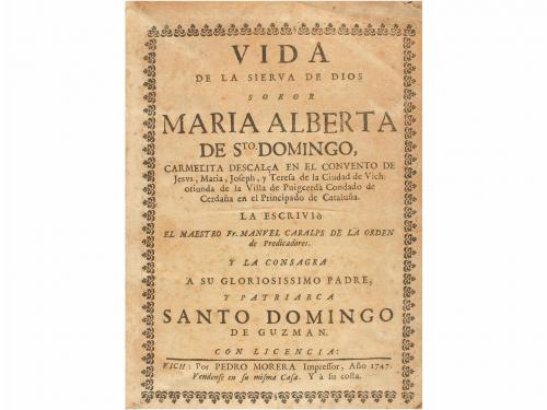 1747. LIBRO. (HUMANIDADES). CARALPS, MANUEL:. VIDA DE LA SIERVA DE DIOS SOROR MARIA ALBERTA DE Sto. DOMINGO, CARMELITA DECALÇA. Vich: por Pedro Morera, Impressor, Vendese en su misma casa, 1747. 8º. 14 h., lámina con retrato de la biografiada grabado al cobre por ´Ignatius Valls. Sculp. Barcinone´. 328 p., 2 h. Pergamino de la época. Buen ejemplar aunque con el papel oscurecido. Palau 43523. PRIMER LIBRO IMPRESO EN VIC. Edición original de esta biografía de Sor María Alberta, nacida en Puigcerdà, y que hizo toda su vida de religiosa en el monasterio de Vic. Pedro Morera fue el primer impresor establecido en esta ciudad catalana y estuvo en activo desde 1747 a 1767.