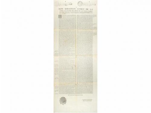 1756. FOLLETO. (REAL PROVISIÓN). GÓMEZ DE LA TORRE, SEBASTIAN:. POR QUANTO EN LA REAL PROVISION..., EL REY, bien informado de que no observase debidamente la Veda de Caza en el tiempo prescripto, se experimenta por todas partes escazèz de ella: segun la Real Orden. Palma de Mallorca: s.i., 1756. Folio elefantino (105x40 cm). Una larga hoja (3 hojas pegadas) impresa a dos columnas, separado por filete tipográfico, en papel sellado. Letra capital xilografica, y escudo de Mallorca. Buen estado. Bando de más de un metro de largo impreso a dos columnas y que contienen el texto de dos Reales Cédulas sobre Caza. Importante y muy raro en estas condiciones.