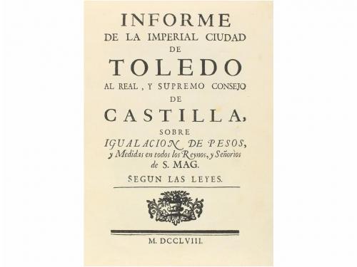 1758. LIBRO. (PESOS-MEDIDAS). INFORME DE LA IMPERIAL CIUDAD DE TOLEDO LA REAL, Y SUPREMO CONSEJO DE CASTILLA, SOBRE IGUALACION DE PESOS, Y MEDIDAS EN TODOS LOS REYNOS, Y SEÑORRÌOS DE S. ,AG. SEGUN LAS LEYES. Madrid: Oficina Joachin Ibarra, 1758. 8º mayor. 2 h. + CCCXCIV p. + 1 h (erratas). Buen papel. Enc. en plena piel de época jaspeada, tejuelo y dorados en la lomera. Cortes pintados. Primera edición de esta obra que contiene los siguientes tratados: [I] Serie cronológica de las Leyes y Providencias Reals desde el Señor Rey Don Alonso X. sobre Pesos y Medidas.- [II] Serie chronológica de las Ordenanzas Municipales de Toledo, sobre Pesos y Medidas.- [III] Reflexiones sobre las Leyes, y Ordenanzas acerca de las Medidas de Espacios, o Intervalos.- [IV] Reflexiones sobre las Leyes y Ordenanzas acercas de las Medidas de Aridos y Liquidos.- [V] Reflexiones [...] acerca de los Pesos.- [VI] Medios prácticos para la Igualción de Pesos y Medidas en toda la Monarquia, según sus Leyes.- [VII] Privilegio del Rey Don Alfonso X. el Sábio, dado a la ciudad de Toledo, en Sevilla a 7 de marzo de 1261, sobre Pesos y Medidas. Palau 119427.