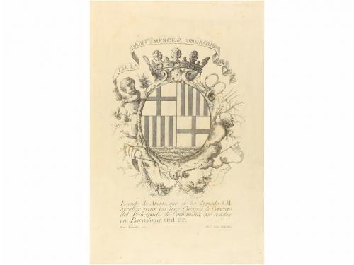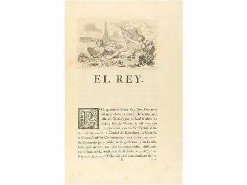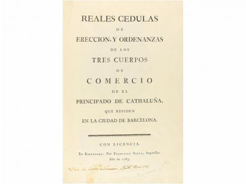 1763. LIBRO. (REALES CÉDULAS). REALES CEDULAS DE ERECCIÓN, Y ORDENANZAS DE LOS TRES CUERPOS DE COMERCIO DE EL PRINCIPADO DE CATHALUÑA, QUE RESIDEN EN LA CIUDAD DE BARCELONA. Barcelona: Imp. Francisco Surià, 1763. Folio menor. 7 h. + 46 p + 1 lám. Primera hoja encabezada con el escudo real calcográfico, en la primera página cabecera calcográfica y capital xilografiada, escudo de armas aprobado para los tres cuerpos de comercio de Cataluña a plena página, al final. Todos los grabados dibujados por Tramullas y grabados por P. Moles. Enc. en pasta española, restaurada, nervios, ruedas doradas en ambos planos, cortes pintados. Anotaciones manuscritas de anterior poseedor. Era habitual que el documento se completase, con paginación propia, con una Real cédula de cinco hojas. Sin embargo, tal como menciona Palau (251868): "existen ejemplares con sólo las 46 p." como el nuestro que, esi sí, incluye el escudo de armas dibujado por Tramullas, raro. CCPB 352287-3.