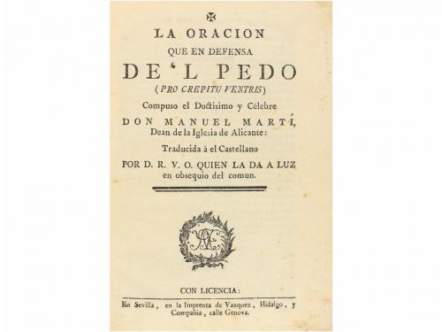 1785 ca. LIBRO. (ESCATOLOGÍA). MARTÍ, MANUEL:. LA ORACION QUE EN DEFENSA DE'L PEDO (PRO CREPITU VENTRIS) COMPUSO... TRADUCIDA AL CASTELLANO POR D. R. V. O. QUIEN LA DA A LUZ EN OBSEQUI DEL COMUN. Sevilla: Imp. de Vazquez, Hidalgo, y Compañia, s.a. 1785 ca. 8º mayor. 2 h.+ XIX p. Enc. en tela del siglo XIX, con estampación de plancha en seco en los planos. Buen estado de conservación. Segunda edición en lengua castellana de este poema escatológico que fue publicado por vez primera en latín, en Madrid 1737, y a la que siguieron otra diversas ediciones y las traduciones al italiano y castellano. Manuel Martí y Zaragoza, nacido en Oropesa (Castellón) en 1663, fue Deán de Alicante; bibliotecario del Cardenal Sáenz de Aguirre en Roma; bibliotecario en Madrid del duque de Medinaceli (1704). Volvió en 1716 a Alicante, donde murió el 21 de abril de 1737. Mantuvo una buena amistad y correspondencia con Mayans y Siscar. Este opúsculo es raro en comercio y tambien en bibliotecas públicas. Aguilar Piñal V, 3063. Palau 153526.