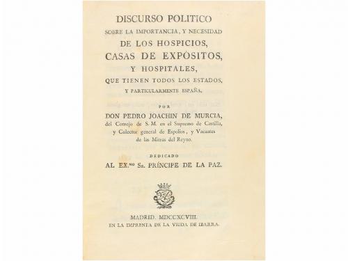 1798. LIBRO. (ECONOMÍA SOCIAL). DISCURSO POLITICO SOBRE LA IMPORTANCIA, Y NECESIDAD DE LOS HOSPICIOS, CASAS DE EXPÓSITOS, Y HOSPITALES, QUE TIENEN TODOS LOS ESTADOS Y PARTICULARMENTE ESPAÑA. Madrid: Imp. vda. de Ibarra, 1798. 8º mayor. 6 h.+ 98+ XXXIV p. Enc. original en pasta española (piel jaspeada) con tejuelo rojo y ruedas doradas en el lomo. Colmeiro anota en la ficha (292) de este libro y su autor: "Contiene noticias interesantes sobre la decadencia de nuestra agricultura e industria, expone los daños y peligros de la ociosidad y vida vagabunda, nota el número excesivo de mendigos, recuerda las leyes y provindencias que se dictaron en diversas ocasiones para atajar el mal, los proyectos que se formaron para fundar albergues de pobres, la historia de varios establecimientos de esta clase, los vicios y abusos de que adolecían y otros pormenores importantes a la economía y administración de los pueblos; y por vía de apéndice, inserta algunos documentos relativos al propio asunto. Es un libro útil, bien escrito y de provechosa enseñanza". Palau 185979. Colmeiro, Biblioteca de los Economistas Españoles, 292. No en Goldsmiths.
