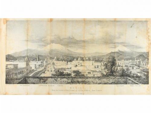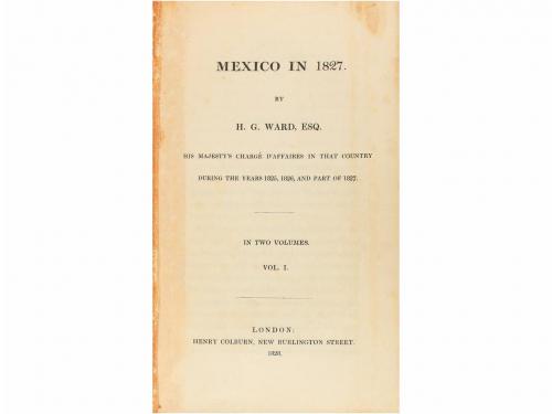 1828. LIBRO. (VIAJES). WARD, H. G.:. MEXICO IN 1827 BY... London: Imp. Henry Colburn (R. and S. Bentley), 1828. 2 vol. en 4º menor. I: XIX + 591 p. II: VIII + 730 p. 13 lám. (7 plegadas y una en color), dibujadas por la esposa del autor y realizadas por J. Clark, T.M. Baynes y W. Gauci, viñetas. Falto de dos mapas plegados. Primera edición de una obra clásica sobre México, escrito poco después de la guerra de independencia contra España. Ha sido considerado el primer -y uno de los mejores- libros de viajes al nuevo estado. Incluye capítulos sobre geografía, sociedad, economía (con especial atención a las mismas), política e historia reciente de México, además del libro de viajes propiamente dicho. El autor, el diplomático H. G. Ward, consta en portada como "His Majesty chargé d'affaires in that country during the years 1825, 1826 and part of 1827". óxido en las primeras y últimas p. Una lám. desprendida del vol. I. Exlibris de anterior poseedor. Dos vol. enc. en media piel y puntas, lomera cuajada, doble tejuelo, nervios, cortes jaspeados.