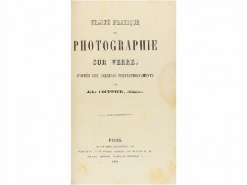 1852. LIBRO. (FOTOGRAFÍA). COUPPIER, JULES:. TRAITÉ PRATIQUE DE PHOTOGRAPHIE SUR VERRE, D'APRÈS LES DERNIERS PERFECTIONNEMENTS. Paris: Ch. Chevalier; Puech et cie; Guilloux [ imprimerie de W. Remquet et cie], 1852. 8º mayor. 61 p.+ 1 h. (blanca). Enc. en media piel. Dos sombras de antigua mancha en los márgenes blancos, puntos de óxido. PRIMERA EDICIÓN de este rarísimo opúsculo. Couppier dedicó (dedicatoria impresa) esta obra a Niepce de Saint-Victor. El fotógrafo francés realizaba imágenes estereoscópias de vidrio de lugares importantes de Francia, Argelia, Bélgica, Italia... Siguió al ejército francés al norte de Italia en 1859 para fotografiar la guerra franco-austríaca donde hizo la primera fotografía conocida de soldados muertos en batalla. fue miembro fundador de la Sociéte Française de Photographie, la primera del mundo.