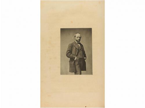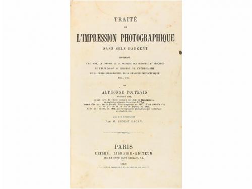 1862. LIBRO. (FOTOGRAFÍA). POITEVIN, ALPHONSE:. TRAITÉ DE L'IMPRESSION PHOTOFRAPHIQUE SANS SELS D'ARGENT. Paris: Leiber, Libraire-Éditeur [imprimerie de E. Donnaud], 1862. 8º mayor. 2 h.+ IV-182 p. 6 Ilustraciones dentro de texto en páginas: 9, 12, 42, 59, 63, 66. 2 grabados estampados calcográficamente frente a las páginas: 55, 65. Una fotografía al carbón sobre papel encolado, frente a la página 155. Enc. de la época en media piel con hierros dorados y título en el lomo liso, inciales de antiguo poseedor. Pequeñas impurezas y algunos puntitos de óxido. RARÍSIMO EJEMPLAR Y PRIMERA EDICIÓN. Este ejemplar conserva la fotografía del retrato del autor, de cuerpo entero. La seguna plancha grabada es la imagen de Napoleón levantando a un oficial arrodillado. Alphonse Poivetin fue un famoso fotógrafo y químico francés, además de ingeniero, descubrió las propiedades sensibles de la luz en la gelatina bicromatada e inventó los procesos de la fotolitografía y fototipia.