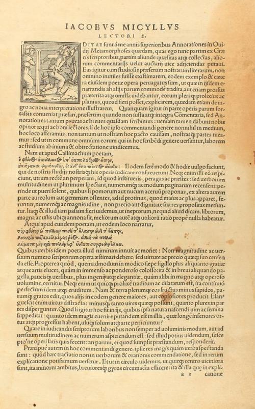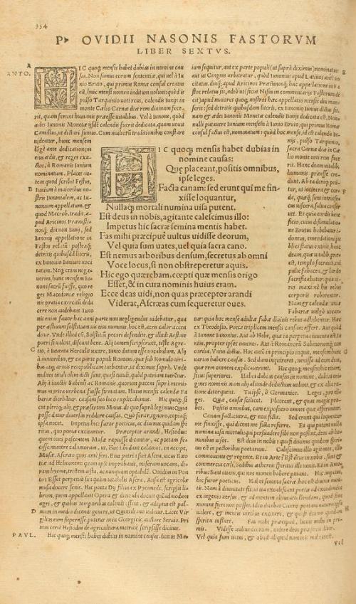 1550. LIBRO. (LITERATURA CLÁSICA). OVIDII NASONIS, P.:. FASTORUM LIBRI VI. TRISTIUM V. DE PONTO IIII. IN IBIN CUM COMMENTARIIA DOCTISS. VIRORUM, Ant. Constantii Fanensis, Pauli Marsi... Basilae: per Ioannem Hervagium, 1550. Folio menor. 4 h. + 793 + 5 h. Xilografía tipográfica en portada, laminada y con antiguas anotaciones. Bellas capitales xilografiadas. Texto en latín, a dos columnas en dos tamaños de tipografía una para el texto y otro para los comentarios que lo enmarcan, apostillas marginales. Última p. remarginada, intermitentes cercos de humedad en el margen exterior e inferior, principalmente en las primeras p.; pequeña galería restaurada en el margen superior de algunas p., en ningún caso afecta texto. Enc. en pleno pergamino de época ligeramente restaurada, lomera rotulada. Antiguas anotaciones manuscritas de anterior poseedor. CCPB 209398-7.