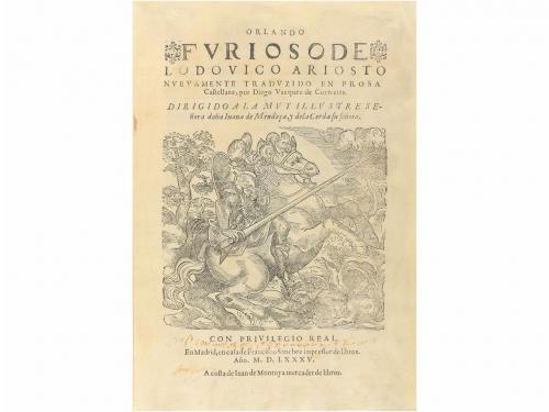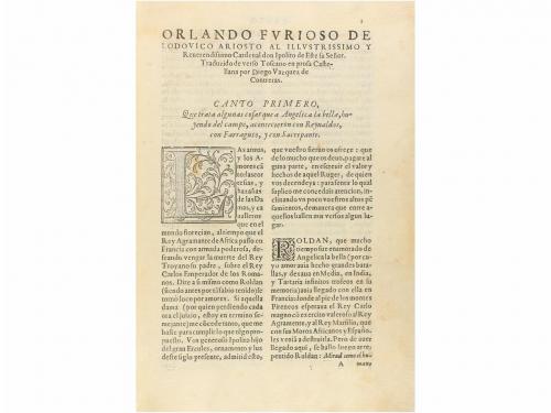 1585. LIBRO. (LITERATURA). ORLANDO FURIOSO DE... nuevamente traduzido en prosa castellana por... Dirigido a la muy ilustre señora doña Juana de Mendoça, y de la Cerda su señora. Madrid: Imp. Francisco Sánchez, a costa de Iuan Montoya, 1585. Folio menor. 6 h. + 236 fol. a dos columnas, con algún error de paginación. Bella xilografía en portada. Capitales. Traducción libre en prosa castellana del gran poema épico-caballeresco del Renacimiento italiano, a cargo del todelano Diego Vázquez de Contreras. Acompaña aprovación de Alonso de Ercilla, autor de La Araucana, quien indica: "En esta traducción van quitadas las cosas licenciosas, y las impertinentes para nuestra nación", tal y como advierte el traductor en su dedicatoria al lector, en que distingue entre la "licencia italiana" y la "libertad española". Tras la aprobación se lee un soneto dedicado al mismo Ercilla. Enc. en pleno pergamino reciente con cierre de cordel. Portada laminada y algunas remarginaciones, ejemplar lavado; antiguas notas manuscritas. Palau 16613: "En esta versión se han cercenado algunas palabras atrevidas y parte de algunos cantos de carácter licencioso...". CCPB 403940-8.