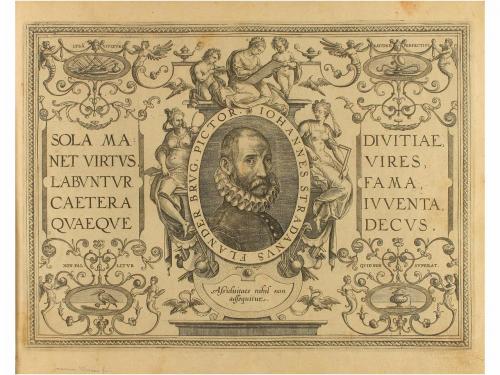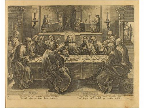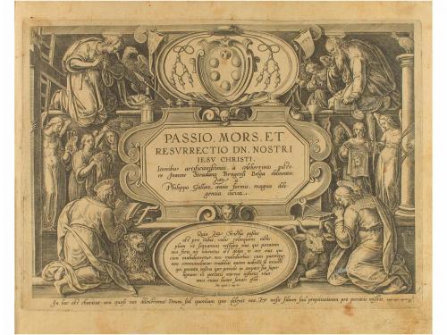 [1587]. GRABADO. (ARTE). STRADANUS, IOHANNES; GALLE, PHILIPPE; COLLAERT, ADRIEN:. PASSIO, MORS, ET RESURRECTIO DN. NOSTRI IESU CHRISTI. Iconibus artificiosissimis a celeberrimo pictore Joanne Stradano Brugensi Belga delineata: a Philippo Gallaeo, aeneis formis magna diligentia inci. [Anvers, Philippe Galle, 1587]. 4º mayor, apaisado. 39 planchas calcográficas, incluida la portada grabada en la que aparecen los cuatro Evangelistas; retrato del pintor Stradanus con preciosa orla de estilo manierista, y 37 planchas con las escenas de la vida de Jesús, numeradas de la 1 a la 37. Amplios márgenes y buen estado de conservación en general. Encuadernación de pergamino flexible. Rara edición original y completa, probablemente de la primera tirada pues no lleva la primera hoja grabada con la dedicatoria del pintor a Ferdinando de Médici, cuando se le concedió el título de Gran Duque.
