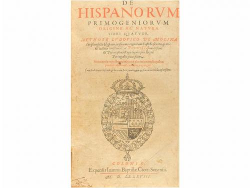 1588. LIBRO. (HISTORIA). MOLINA, LUCOVICO DE:. DE HISPANORUM PRIMOGENIORUM ORIGINE AC NATURA. Colonia: Joannis Baptistae Ciotti Senensis, 1588. Folio menor. 6 h. inclusive portada a dos tintas con gran escudo real de España + 536 p.+ 26 hojas. Enc. de la época en plena piel con nervios y hierros dorados en el lomo, tejuelo, cortes pintados, plano anterior rozado. Muy rara tercera edición, la primera impresa fuera de España y destinada a los juristas de Europa en una época de esplendor para el rey de las Españas.