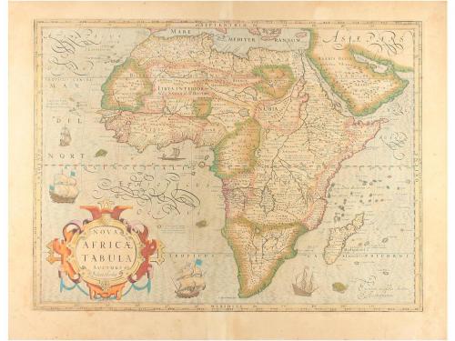 1610 ca. MAPA. (ÁFRICA). HONDIUS, F.:. NUOVA AFRICAE TABULA. AAmmstelodami, 1610 ca. Mapa calcográfico. Papel: 45,5 x 57,5 cm; huella: 37,5 x 51,5 cm. Iluminado a mano. Reverso con texto en latín con capital y culs-de-lampe xilografiadas. Es un mapa basado en Mercator del ATLAS SIVE COSMOGRAPHICAE...", pero la línea de la costa, especialmente la de Madagascar, fue considerablemente alterada. En el área del Cabo especialmente, y en general en todo el mapa, mejoras geográficas. Muy ornamentado, con barcos, animales y monstruos marinos, caligrafía cuidada. Referenciado por Tooley p. 54. Norwich 27. Koeman ME27A. Antigua señal de doblez central, pequeñas restauraciones profesionales.