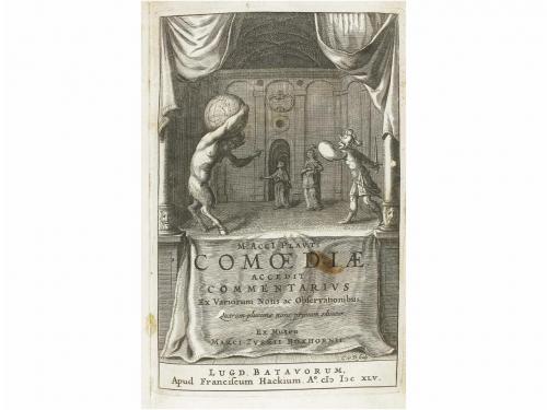 1645. LIBRO. (LITERATURA CLÁSICA). PLAUTO, TITTO MACCIO:. COMOEDIAE. ACCEDIT COMMENTARIUS EX VARIORUM NOTIS AC OBSERVATIONIBUS, QUARUM PLURIMAE NUNC PRIMUM EDUNTUR. EX MUSEO MARCI ZVERII BOXHORNII. Lugduni Barvorum (Leiden): Apud Franciscum Hackium, 1645. 8º. 8 h. (inclusive portada grabada)+ 1136 p.+ 24 h. Letras iniciales xilográficas. Texto en latín y griego. Algún punto de óxido. Enc. en pergamino de la época, título rotulado en el lomo, cortes pintados. Una de las buenas ediciones de las Comedias de Plauto, por sus notas y comparaciones de textos de varios manuscritos.