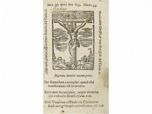 [1647]. LIBRO. (HUMANIDADES). DESTIERRO Y AZOTE DEL LIBRO DEL DUELO. [Valencia: Jusepe Gasch, 1647]. 8º menor. 23 h. (de 24, falta portada) + 293 p.+ 2 h. Pergamino de época con título rotulado en el lomo. Pequeña falta en el plano anterior aunque buen ejemplar. Un grabado de Cristo en la cruz. Segunda edición de este texto publicado por vez primera en Zaragoza, 1640, y posteriormente esta edición valenciana, de la que solo se conoce un ejemplar en bibliotecas públicas españolas. Las ´licencias´ son de Zaragoza, 1636; y Valencia, 1645. Dice el autor en su ´Prologo al Lector´: ´Lo mismo que el enemigo de las almas, para la total perdición dellas, procuró en Zaragoza, ha procurado en Valencia, porque si alli procuró estorbar la primera impression deste libro, como hemos dicho en este Prólogo, aqui ha procurado impedir la segunda, enfriando por todos caminos las voluntades de los fieles para que no alentassen dicho libro (...) Pero para preservarlo de la muerte, la provindencia divina le ha dado una grande vida, tan eficaz que lo ha sacado a luz. (...) Doy pues las gracias desta dicha, y deste parto en su intelectual y espiritual vida al Doctor don Gaspar Vidal.´ .