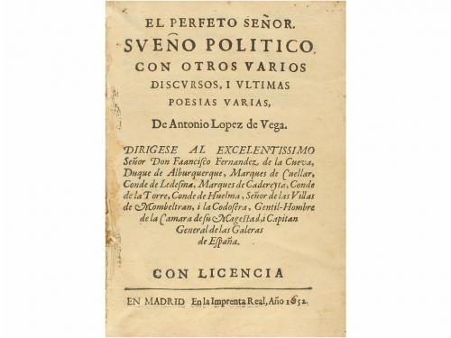 1652. LIBRO. (MADRID). LOPEZ DE VEGA, ANTONIO:. EL PERFETO SEÑOR. SUEÑO POLÍTICO CON OTROS VARIOS DISCURSOS, I ULTIMAS POESIAS VARIAS. Madrid: Imp. Real, 1652 (impreso por error 1852). 8º mayor. 6 h. + 259 p. Enc. en pergamino de época semidesprendido, con la lomera rotulada. Buen ejemplar, aunque con alguna pequeña mancha de tinta en tres páginas. Obra muy rara. Hacia el final de su vida, este humanista y poeta, amigo de Lope de Vega, recoge en esta edición una de sus primeras obras, "El Discurso del Perfeto Señor", que había aparecido en Madrid en 1626. Palau 142195. Salvá 742.