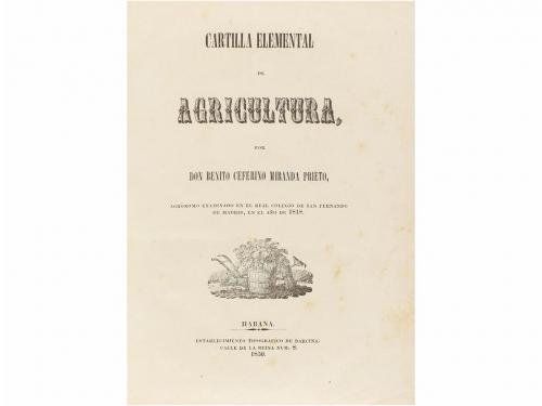 1850. LIBRO. (AGRICULTURA-HABANA). MIRANDA PRIETO, BENITO CEFERINO:. CARTILLA ELEMENTAL DE AGRICULTURA POR... Habana: Establecimiento tipográfico de Barcina, 1850. 8º mayor. 173 p. + 1 h. + 10 p. Portada con grabado tipográfico con algún punto de óxido. Bella enc. de época en plena piel, cortes dorados, planos enmarcados y en dorado en el anterior: Escmo. S. D. Francisco Armero y Peñaranda.
