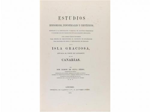 1875. LIBRO. (ECONOMIA-CANARIAS). SILVA FERRO, RAMON DE:. ESTUDIOS ECONÓMICOS, INDUSTRIALES Y CIENTÍFICOS RESPECTO Á LA EXPLOTACION Y RIQUEZA DE ALGUNAS PESQUERIAS Y CONSUMO DE SUS PRODUCTOS EN LOS GRANDES MERCADOS... EN LA ISLA GRACIOSA, SITUADA AL NORTE DE. Londres: Imp. Clayton, 1875. 4º mayor. XVI + 217 p. y 2 mapas plegados. Ilustr. con figuras en el texto. Puntos de óxido. Enc. en tela.