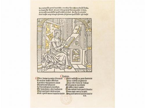 1980 ca. LIBRO. (FACSÍMIL). DANSES HISTORIÉES: LA danse macabre des femmes toute hystoriée & augmentée de nouveault personnaiges... Paris: Union Latine Éditeur, 1980 ca. 41 h. Sin paginar. Profus. ilustr. Texto a dos columnas, a dos tintas. Facsímil del original de 1491. Enc. en arpillera editorial, con protección de plástico.
