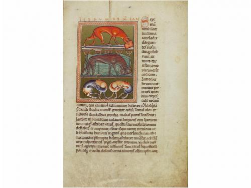 1983. LIBRO. (FACSÍMIL). BESTIARIO DE OXFORD. Madrid: Ed. de Arte y Bibliofilia, 1983. 2 vol. en 4º mayor. Facsímil de 104 fol. con abund. ilustr. en color y dorados. Enc. en plena piel con decoraciones doradas en los planos, lomera rozada, presentado en petaca. Obra facsímil del Bestiarium, Ms. Ashmole 1511 de la Biblioteca Bodleian de la Universidad de Oxford. Con libro de estudio a cargo de Carmen Andreu, Xénia Muratova y Daniel Poirion. Edición numerada de 495 ejemplares.