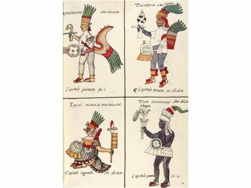 1984 ca. LIBRO. (FACSÍMIL-HISTORIA DE AMÉRICA). INTRODUCCIÓN A LA HISTORIA GENERAL DE LAS COSAS DE NUEVA ESPAÑA. [Madrid: Club Internacional del libro, 1979.] 3 vol. en fol. Reproducción facsímil del único manuscrito de este códice que se conserva en la Biblioteca Medicea-Laurenziana de Florencia. Texto dos columnas con una caligrafía muy pulcra, y dibujos a color en el texto. Edición conmemorativa enc. en símil piel, cortes pintados; cada vol. presentado en un estuche también en símil piel. La obra constituye un testimonio de primera mano y muy detallado de cómo vivían los pueblos indígenas del nuevo continente. El autor entrevista a los ancianos y de su tradición oral bebe. Esta edición se acompaña de una introducción de Isidro Sepúlveda Muñoz. Presentación de Javier Tusell Gómez.