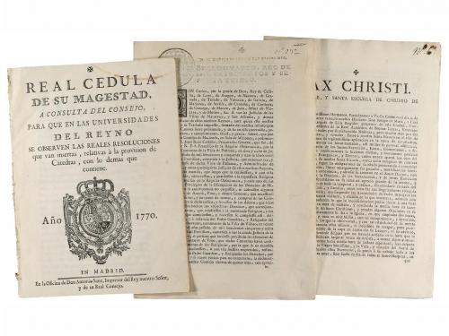 1762, 1765, 1770. MANUSCRITO. (EDUCACIÓN). DOS DOCUMENTOS Y UNA REAL CÉDULA. Todos impresos, 4º mayor. Los dos primeros relativos a escuelas religiosas. El tercero es una real Cédula sobre las reales resoluciones que deben observar las universidades del reino respecto a la provisión de cátedras. Interesante conjunto.