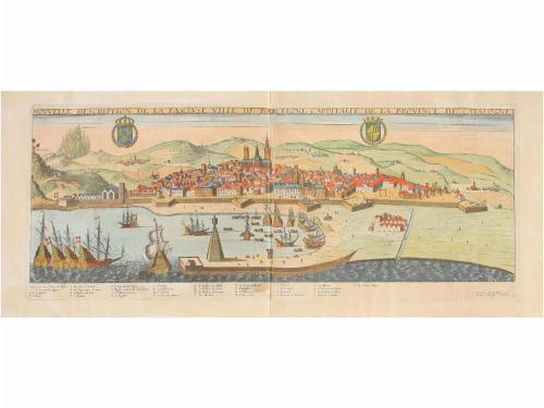 1646. GRABADO. (BARCELONA). BOISSEAU, JEAN; BOISSEVIN, LOUIS:. NOVVELLE DESCRIPTION DE LA FAMEVSE VILLE DE BARCELONE CAPPITALLE DE LA PROVINCE DE CATALOGNE. A Paris: chez Lou[is] Boissevin a la rue St Jaques a Limage, 1645. 29 x 71 cm huella, 34 x 82 cm papel, grabado en dos hojas. Coloreado, márgenes algo sucios. Algún refuerzo al dorso. Cat. Soley, 21.