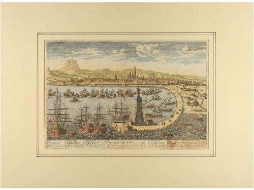 1690 ca. GRABADO. (BARCELONA). AVELINE:. BARCELONE, VILLE CAPITALE DE LA PRINCIPAUTÉ DE CATALOGNE. Grabado al cobre coloreado. 22 x 32 cm. Algún punto de óxido. Cat. Soley 44B.