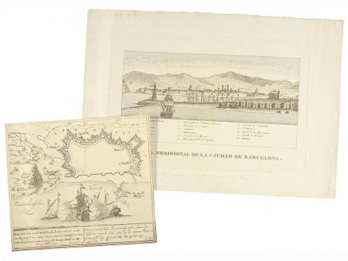 1705 y s. XIX. GRABADO. (BARCELONA). DOS VISTAS DE BARCELONA. El primer grabado, 16 x 18 cm, presenta el plano de Barcelona sus fortificaciones, con una bonita imagen de un batalla naval en primer plano, bajo el grabado el texto en alemán y latín y la firma del grabador SCHENK. [Más:] ESTRUCH, D.: VISTA MERIDIONAL DE LA CIUDAD DE BARCELONA. 16,5 x 25 cm huella y 22,5 x 32 cm papel. Este grabado forma parte de un conjunto de vistas de poblaciones catalanas editadas s.l.n.a. durante la I Guerra Carlista (1833-1840). Cat. Soley 480.
