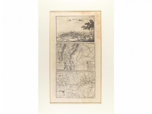 1720 ca. GRABADO. [BEAULIEU:]. GIRONA. Tres grabados de Girona de 11 x 15 cm sobre una gran hoja de papel. El primero de ellos contiene una vista general de la ciudad, el segundo un mapa con el plano de la villa y el tercero un mapa de la zona y los pueblos circundantes. Leve cerco de humedad en una esquina.