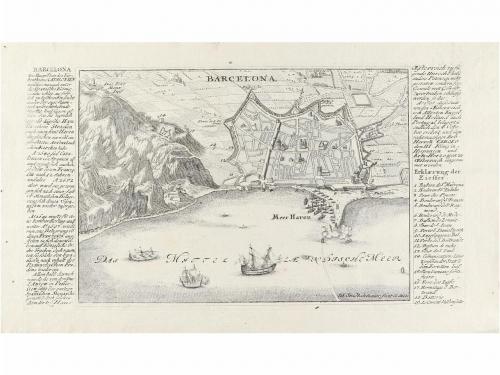 1725 ca. GRABADO. (BARCELONA). STRIDBECK, IOH.; [BODENEHR, GABRIEL]:. BARCELONA. Plano de la ciudad de Barcelona con una columna de texto a cada lado de la imagen. 15 x 27,5 cm huella, 19 x 32 cm papel. Cat. Solery 162A .