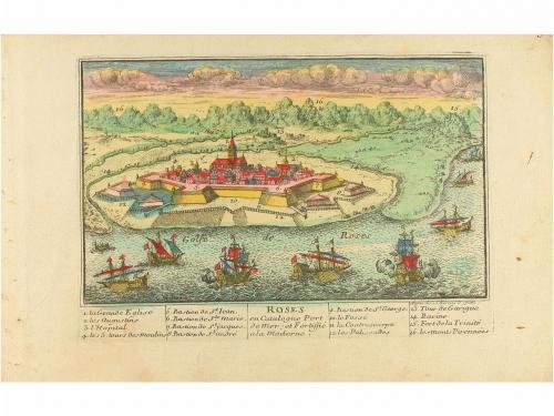 1800 ca. GRABADO. (ROSES). DOS GRABADOS A COLOR DE ROSES. El más antiguo de ellos 15 x 22 cm huella y 19 x 31 cm papel. Coloreado posteror, muestra la población fortificada de Roses. Firmado en París en plancha por Chereau le jeune. El segundo es grabado cromolitográfico firmado por Dupressoir.