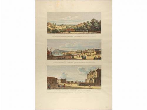 1806. GRABADO. (BARCELONA). MOULINIER, JACQUES; BAUGEAN, J. JEROME; LORIEUX, F. B.; DIDOT, PIERRE; LABORDE, ALEXANDRE DE:. TRES VISTAS: VISTA DE BARCELONA TOMADA EN SARRIA EN EL JARDIN DE LOS CAPUCHINOS/ VISTA DE UNA PARTE DEL PUERTO DE BARCELONA TOMADA DE BARCELONETA/ VISTA DE LA LONJA DEL... DE LA ADUANA Y DE LA PUERTA. Tres grabados al aguafuerte de 12,5 x 29 cm en un solo folio de 60 x 43 cm. Coloreados. Puntos de óxido marginales. En Cat. Soley 354, 358 y 364, no los referencia juntos como aquí.