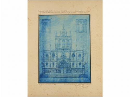 1879. GRABADO. (BARCELONA). TENA, RAMON:. FOTOGRABADO QUE REPRODUCE EL PROYECTO DE FACHADA DE LA CATEDRAL DE BARCELONA SEGÚN DISEÑO DE MANUEL GIRONA. Reproducción el proyecto de fachada en papel azulado 21 x 16 cm sobrepuesto en cartulina de 31 x 24 cm. En el margen superior e inferior de la cartulina reza la siguiente incripción manuscrita "Proyecto de fachada de la Catedral de Barcelona segun la idea del Extmo. Sr. Dn. Manuel Girona basada en la existente en la mis-/ma y parte central conservada en dibujos en el archivo de la propia catedral, dibujada y desarrollada por Ramon Tenas Hostench/ Barcelona y Noviembre de 1879. A mi querido amigo Juan Soler y Ferrer" y firma de Ramon Tenas.