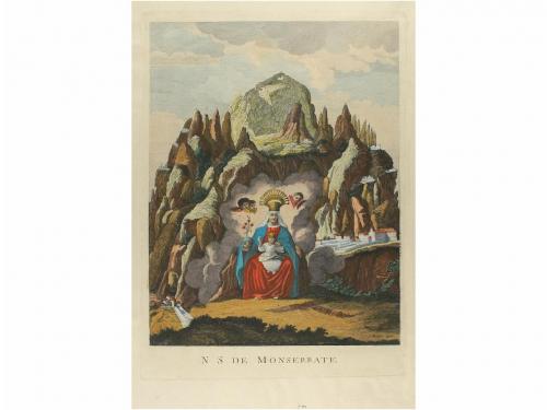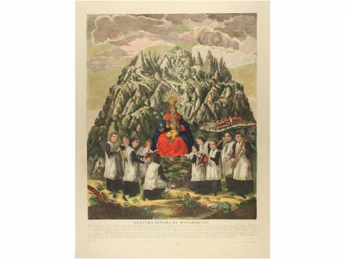 1796. GRABADO. (MONTSERRAT). [SALLENT, JOAN Y MARIA TERESA:]. NUESTRA SEÑORA DE MONSERRATE. 51 x 40 cm huella, 57 x 43,5 cm papel. Gran grabado coloreado de la virgen de Montserrat recibiendo adoración y en la parte inferior texto explicativo en plancha.[Más:] N. S. DE MONSERRATE. 38 x 27,5 cm huella y 43 x 30,5 cm papel. Grabado coloreado de la Montaña y la virgen con el niño.