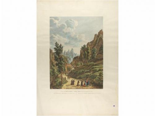 1800 ca. GRABADO. (MONTSERRAT). MOULINIER y FORTIER:. VISTA GENERAL DE MONT-SERRAT, TOMADA DESDE LA HERMITA DE St. MIGUEL. 38 x 48 cm huella, 43,5 x 58,5 cm papel. [Más:] DELABORDE y GUILLOT: CUATRO VISTAS DE MONTSERRAT. Grabadas en una gran hoja de papel, cada imagen de 16 x 12 cm con las ermitas de Sta. Ana, S. Trinitat, S. Dimas y el convento de Montserrat. [Más:] MOULINIER y L. GARREAU: ENTRADA DEL MONASTERIO DE MONT-SERRAT, POR EL CAMINO DE COCHES. 46,5 x 34,5 huella, 59,5 x 42,5 cm papel. Coloreado. Todos ellos para la obra de Laborde "Voyage pittoresque et Historique de l`Espagne...". Algún punto de óxido.