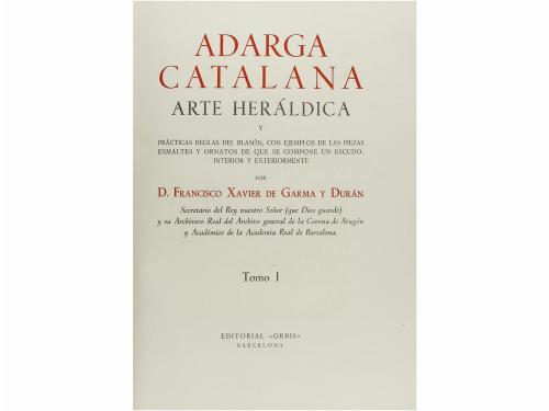 1954. LIBRO. (HERÁLDICA-BIBLIOFILIA). GARMA Y DURAN, FRANCISCO XAVIER:. ADARGA CATALANA. Arte heráldica... Barcelona: Edit. Orbis, 1954. 3 tomos en 2 vol. en 4º menor. I: XXX + 1 h. + 146 p. + 1 h. + 9 lám. II: 61 p. + 8 lám. III: 66-206 p. + 20 lám. Grabados impresos con las planchas originales. Rústica ilustrada en estuche de cartoné jaspeado. Edición de 175 ejemplares. [Más:] SABATÉ MILL, ANTONIO:. 10 GLOSAS DE FIESTA MAYOR. Ilustaciones de Pablo Boada. Vilafranca del Panadés: Ed. Verde y Azul, 1945. 4º. 28 p. + 2 h. Ilustraciones del texto coloreadas a mano. Enc. en tela edit. con tejuelo sobrepuesto en el plano, coloreado. Edición numerada de 30 ejemplares coloreados a mano.
