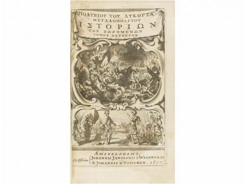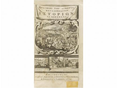 1670. LIBRO. (HISTORIA- CLÁSICA). POLIBII LYCORTAE:. HISTORIARUM. Comentarios de Isaaco Casaubono. Amstelodami: Johannis Janssonii à Waesberge & Johannis van Someren, 1670. 3 vol. en 8º. I: 8 h. (incluido frontis) + 908 p. II: 1 h. de 909 a 1816 p. III: 5 h. (incluido frontis) + 462 p. Tres vol. con texto a dos columnas en tipografía griega e itálica. Alguna fina galería marginal. Enc. en pergamino rígido de época, con las lomeras rotuladas, planos rozados y el anterior del primer vol. con antiguos restos de tinta roja. En estos tres vol. se recoge el trabajo que el historiador romano Polibio había realizado; se centra en la historia contemporánea y comienza en el 264 a.C. hasta el 146 a.C., época en la que Roma entró en guerra dos veces con Cartago (primera y segunda guerra púnica).