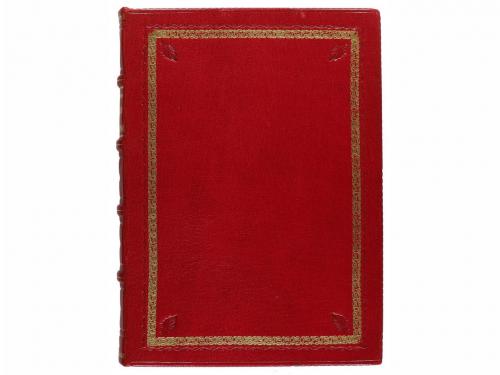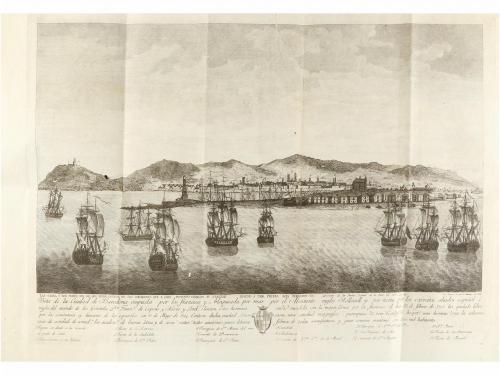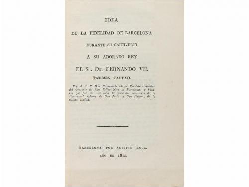 1814. LIBRO. (BARCELONA). FERRER, RAYMUNDO:. IDEA DE LA FIDELIDAD DE BARCELONA DURANTE SU CAUTIVERIO A SU ADORADO REY EL SR. DN. FERNANDO VII, TAMBIÉN CAUTIVO. Barcelona: Ed. Agustín Roca, 1814. 4º menor. 1 h. + 120 p. + 1 h. Ilustr. con 5 lám. calcográficas, una de ellas plegada y que corresponde a la "Vista de la ciudad de Barcelona ocupada por los franceses y bloqueada por mar por el almirante inglés Hollowell...", grabada por José Coromina en 1814, texto al pie dentro de la huella; con una pequeña rasgadura en el margen superior. A partir de la p. 62 galería en el margen interior, aun así buen ejemplar. Bella enc. en plena piel con dorados y hierros secos en ambos planos, cantos. Palau 90385 indica que habitualmente los ejemplares de esta obra sólo constan de tres láminas de las cuatro que deben contener, este ejemplar está completo y se le añade el mapa plegado. Exlibris de anterior poseedor.