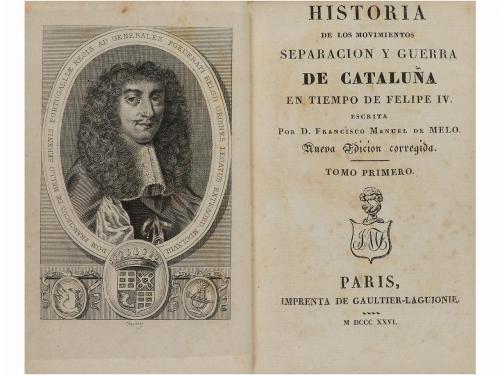 1826. LIBRO. (HISTORIA CATALUNYA). MELO, FRANCISCO MANUEL DE:. HISTORIA DE LOS MOVIMIENTOS SEPARACIÓN Y GUERRA DE CATALUÑA EN TIEMPO DE FELIPE IV. NUEVA EDICIÓN CORREGIDA. Paris: Imprenta de Gaultier-Laguionie, 1826. 2 vol. en 16º. I: Frontis retrato+ 282 p.+ 1 h. II: 217 p.+ 1 h. Leves puntos de óxido.2 vol. enc. en plena piel de la época con hierros dorados en los planos y lomos, cejas cantos algo rozados, cortes dorados. Palau 160433. Estos dos tomos forman parte de la Colección de clásicos españoles, que había empezado a publicar en París Joaquin Maria Ferrer.