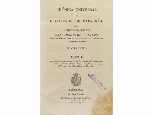 1829-1832. LIBRO. (HISTORIA DE CATALUNYA). PUJADES, GERONIMO:. CRONICA UNIVERSAL DEL PRINCIPADO DE CATALUÑA ESCRITA A PRINCIPIOS DEL SIGLO XVII. Barcelona: José Torner,1829-1832. 8 vols. en 4º mayor. I: XLII + 234 p. II: 2 h. + 330 p. III: 2 h. + 309 p. IV: 2 h.+ III +346 p. V: 5 h. + X p., 15 h. + 365 p. VI: VII + 491 p. VII: 1 h. + IV + 567 p. VIII: 2 h.+ IX + 536 p. Enc. en media piel, nervios, cortes jaspeados. Sello húmedo de anterior propietario.