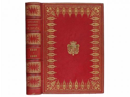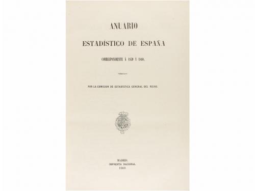 1860. LIBRO. (HISTORIA-ENCUADERNACIÓN). ANUARIO ESTADÍSTICO DE ESPAÑA CORRESPONDIENTE Á 1859 Y 1860. Madrid: Imp. Nacional, 1860. 4º. XXXVIII + 598 p. + 1 h. Ilustr. con numeros estados y un mapa a doble página, en el texto. Enc. firmada por GINESTA en plena piel con ruedas doradas en ambos planos, hilos, cejas y cantos dorados, nervios y lomera cuajada. Escudo dorado en ambos planos.