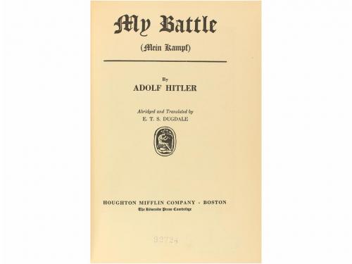 [1933]. LIBRO. (HISTORIA). HITLER, ADOLF:. MY BATTLE ( MEIN KAMPF). Boston [Cambridge, Massachusetts]:Houghton Mifflin Company [The Riverside Press], [1933]. 8º mayor. Lámina con fotografia (Der Fuehrer), VIII-297 páginas. Tela editorial color ocre con estampación en lomo y plano en tinta roja, camisa impresa original. Ligeras reparaciones en la camisa pero sin pérdidas, la enc. con una sombra de mancha en la parte superior del lomo sin afearlo, buen estado de conservación en general. Sello de la Bibl. del Ins. Int. Expurgo. Etiqueta de donación de anterior propietaria. Primera edición en lengua inglesa de uno de los libros más prohibidos por su ideología supremacista. Ejemplar con una anotación a pluma y dos firmas, con la fecha de 19 de noviembre 1938 y la dedicatoria ´Good luck, Marina !´, una ilustre escritora de la generación del 27 .