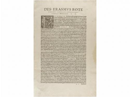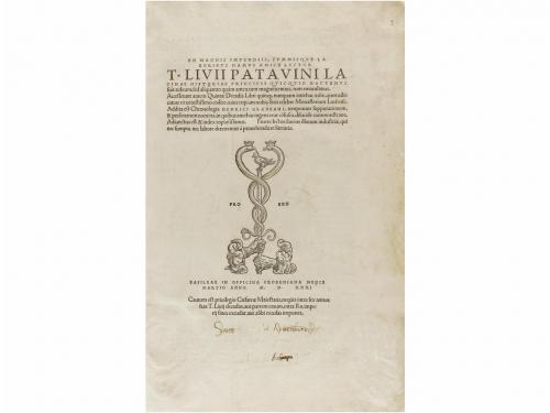 1531. LIBRO. (HUMANIDADES). T. LIVII:. PATAVINI LATINAE HISTORIAE PRINCIPIS QUICQUID HACTENUS SUIT AEDITUM... Basilae: In officina frobeniana, 1531 (en portada y colofón). Folio. 4 h. + 244 p. + 243 p. + 210 p. + 1 h. + 91 + 36 h. + 45 p. Portada con grabado tipográfico; bellas capitales xilografiadas. Amplios márgenes, apostillas marginales, impresas y manuscritas. Cerco de humedad en el margen exterior en las 4 primeras p.; ligeras restauraciones de puntas y cortes, antiguo cerco de humedad en el margen interior que afecta el último libro. Rara edición basada en un manuscrito localizado en Maguncia a inicios del siglo XVI por Wolfgang Angst y Nicolaus Carbach. Prefacio de Erasmo de Rotterdam dedicado a Carolo Montioio. Enc. en plena piel con alma de madera, marcos de hierros secos en ambos planos, lomera reconstruida, tejuelo. Antiguas anotaciones manuscritas. Brunet III, Col. 1105.